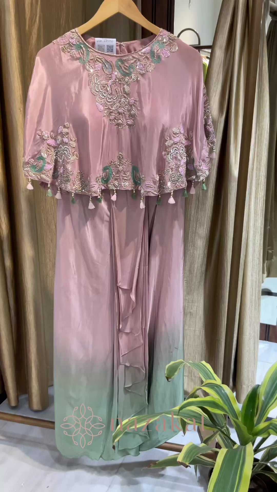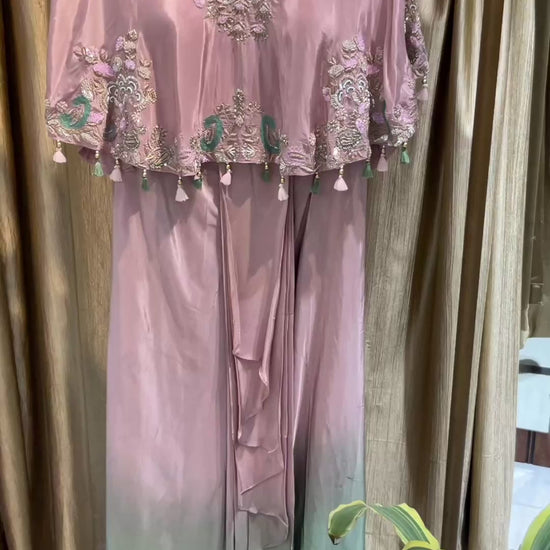 A beautifully crafted cape and cowl set in soft crepe fabric, featuring delicate hand embroidery on the cape with subtle tassel detailing along the hem.