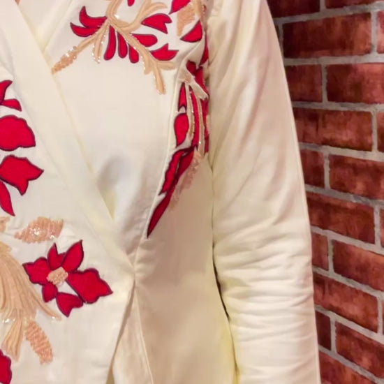 A beautifully crafted wrap-style top paired with flowy palazzo pants, highlighted with intricate details