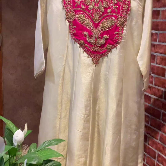 Elegant white tissue Anarkali featuring a beautifully handworked contrasting yoke and bright dupatta for a pop of color. Comes with matching pants and soft inner lining for comfort.