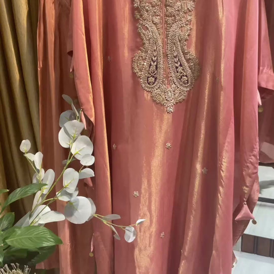 A luxurious kaftan set crafted in premium tissue fabric, adorned with intricate Keri motifs and delicate handwork for an effortlessly regal look.