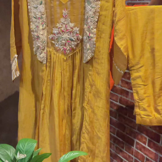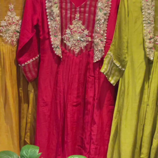 2 piece set in Mul Chanderi with cotton silk pants, detailed with a tissue patch in between and finished with a stunning zardozi boota. Perfect for festive & special gatherings.